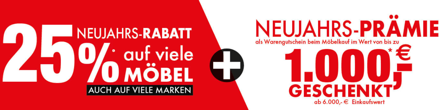 Zum Jahreswechsel bieten wir Ihnen 25 Prozent auf viele Möbel unseres Sortiments – darunter auch Möbel vieler renommierter Marken. Neben unserem Neujahrs-Rabatt können Sie zusätzlich eine großartige Neujahrs-Prämie, mit der Sie bis zu 1.000 Euro sparen können, erhalten. Die Prämie, welche wir Ihnen in Form eines Gutscheins zur Verfügung stellen, ist nach Einkaufswert gestaffelt: Bereits ab 750 Euro erhalten Sie einen Preisnachlass von 100 Euro. Ab einem Einkaufswert von 1.500 Euro erhalten Sie einen Gutschein über 200 Euro und ab 3.000 Euro sparen Sie ganze 500 Euro. Sollten Sie sich für Möbel mit einem Einkaufswert von über 6.000 Euro entscheiden, bekommen Sie sogar 1.000 Euro geschenkt. Sind Sie noch auf der Suche nach dem ein oder anderen Möbelstück für Ihr Zuhause? Dann nutzen Sie die einmalige Chance unserer Neujahrsaktion bis zum 26.01.19 und besuchen Sie eine unserer Opti-Wohnwelt-Filialen in Ihrer Nähe! Bei uns finden Sie eine vielfältige Auswahl an stilvollen Möbeln, frei planbaren Küchen, innovativer Beleuchtung und Wohnaccessoires.