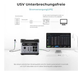 - USV-Backup: Diese Solarstromanlage ist mit einer USV-Funktion ausgestattet. Sobald ein Stromausfall auftritt, wird das P2001 plus sofort in Betrieb genommen, um die Computer und Geräte mit Strom zu versorgen; eine Standby-USV greift bei allgemeinen Stromproblemen wie Stromausfall, Spannungsabfall oder Spannungsüberlastung auf die Batterie zurück.
