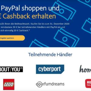 Bei Paypal gibt es seit heute eine neue Aktion, bei der ihr 20€ Cashback bekommen könnt. Ihr müsst dafür 3 mal in bestimmten Shops für je 30€ einkaufen und mit Paypal bezahlen. Das ganze könnt ihr bis zum 31.12.20 machen.