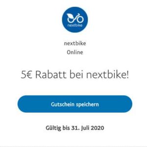 Bei Paypal könnt ihr euch gerade 5€ Rabatt bei nextbike sichern! Speichert euch schnell den Gutschein ab, ihr könnt ihn bis zum 31.7. einlösen.