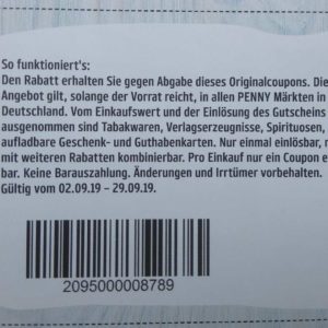 Einschränkungen:- gültig vom 02.09. bis 29.09.2019- ab 20 Euro Einkaufswert, divesere Auschlüsse, wie Tabwawaren, Gutscheinkarten, …- nur im Original gültig
