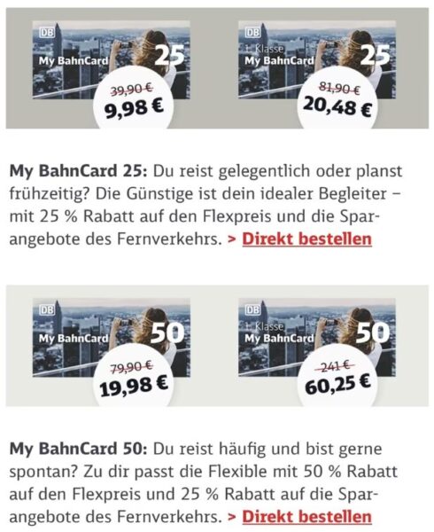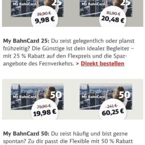 Also, eingeladene Kunden per E-Mail bekommen gerade die BahnCard 25 und 50 mit 75% Rabatt: