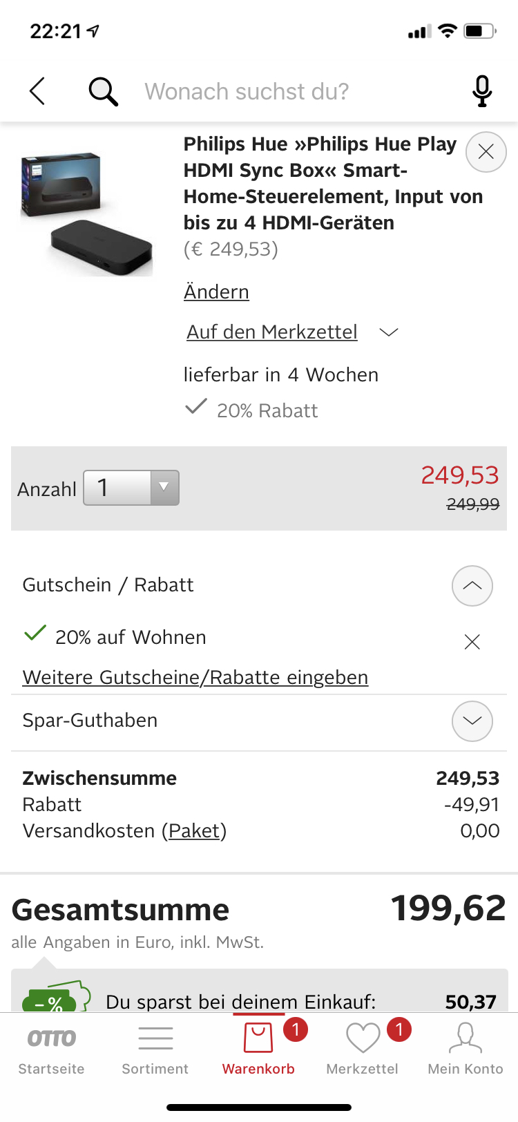 Der Reduzierte Preis kommt durch den Einsatz des 20% Gutscheincodes 14655 auf dem Bereich „Wohnen“. Achtung gilt nur bis morgen 01.11.20.