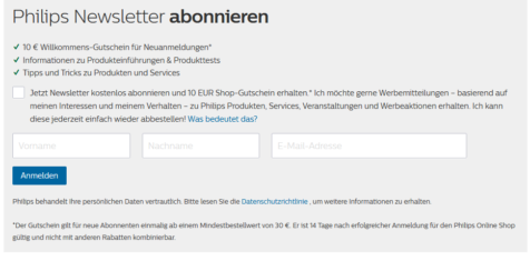 *Der Gutschein gilt für neue Abonnenten einmalig ab einem Mindestbestellwert von 30 €. Er ist 14 Tage nach erfolgreicher Anmeldung für den Philips Online Shop gültig und nicht mit anderen Rabatten kombinierbar.