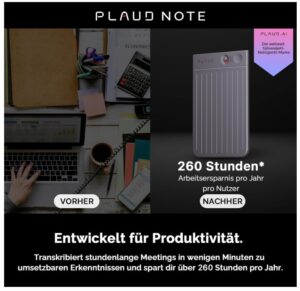 - Ihre Privatsphäre steht an erster Stelle: Lokale Daten werden verschlüsselt, Cloud-Dateien sind exklusiv für Sie zugänglich, Die Datenverarbeitung erfolgt nur mit Ihrer Genehmigung. Die Apps und Webportale von PLAUD bieten unbegrenzte Cloud-Speicher. Verwalten Sie Audiodateien mühelos, sortieren Sie sie und teilen Sie Aufnahmen, Transkriptionen und Zusammenfassungen ganz einfach. Verbessern Sie die Zusammenarbeit im Team mit Transkriptions- und Zusammenfassungsfunktionen