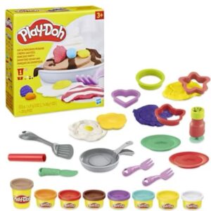 Jetzt kann die Pancake Party starten! Mit der speziellen Bratpfanne in diesem Set können kleine Feinschmecker ihre Pancakes spielend in die Luft schnippen und mit der Pfanne wieder auffangen. Mit den Ausstechern und 8 Dosen Play-Doh entstehen fantasievolle Pancakes in 4 verschiedenen Formen, die vergnügt hochgeschnippt und dann auf den Tellern gestapelt werden können. Mit der Sirup-Knetpresse und den Förmchen können die Kreationen dann noch fantasievoll dekoriert werden. Dieses Set eignet sich hervorragend als Geschenk für kleine Knetköche ab 3 Jahren. Hasbro, Play-Doh, and all related properties are trademarks of Hasbro.