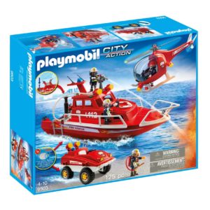 Das Set beinhaltet ein Feuerlöschboot mit Pumpe, einen Feuerwehr-Helikopter und ein Feuerwehr-Amphibienfahrzeug.