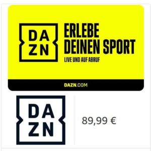 Dein Sport Streaming Service – Gutschein per E-Mail **19.99€ Rabattabzug an der Kasse für Prime-Mitglieder, also statt 89,99 Euro nur 70,00 Euro. Sendet Euch dazu einen Geschenkgutschein mit dem DAZN-Gutscheincode und zahlt an der Kasse glatte 70 Euro für den 9 Monatsgutschein, also kostet der Monat 7,77 Euro.