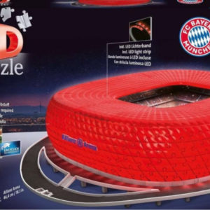 Sie ist das Wohnzimmer des erfolgreichen FC Bayern München und Schauplatz vieler emotionaler Fußballmomente: Die Allianz Arena. Besonders eindrucksvoll zeigt sich das Stadion jedoch nach Anbruch der Dunkelheit, wenn es im imposanten Rot erstrahlt. Für ähnlich atmosphärische Momente sorgt auch die originalgetreue 3D Puzzle Nachbildung, denn mit diesem 3D Puzzle Stadion im Miniaturformat erschaffen Sie Ihre eigene Rekordstätte – 3D Puzzlespaß garantiert! Die 216 stabilen und gewölbten Kunststoff-Puzzleteile passen dank der einzigartigen Easyclick Technology perfekt zusammen und lassen im Zusammenspiel mit den zahlreichen Zubehörteilen ein formstabiles Bauwerk entstehen # ganz ohne Kleben, dafür mit der einzigartig nachempfundenen Membranstruktur des Originals. Dank der nummerierten Teile und der bebilderten Anleitung ist das Gelingen garantiert. Ist das Bauwerk erst einmal vollendet, kann die dem Original nachempfundene weiße Tagversion mithilfe eines innenseitig verbauten LED-Schlauches mit roten LEDs in eine beeindruckende Nachtversion verwandelt werden. Erforderlich 3 Microbatterien.