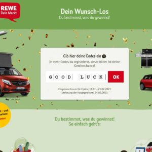 Du kannst dich bis zum 23.02.2021 auf rewe.de/wunsch-los unter Angabe deiner persönlichen Daten registrieren und den Code deinem Wunsch-Gewinn zuordnen. Hauptgewinn-Verlosung am 24.02.2021.