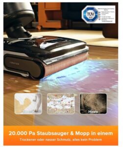 - Schlierenfrei & kein Feststecken: Verabschiede dich von Strähnen und verheddertem Haar mit unserem innovativen Doppelschabersystem. Dieser Staubsauger ist so konzipiert, dass er mit Wasser umgehen kann, ohne zu verstopfen, und jedes Mal ein makelloses Ergebnis liefert. Mit Zertifikaten von SGS und TÜV im Rücken, können Sie beruhigt reinigen, denn Sie wissen, dass Ihre harten Böden ohne unansehnliche Rückstände glänzen werden.
