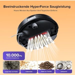 - HyperForce-Saugkraft: Mit einer beeindruckenden Saugleistung von 10.000 Pa ist dieses leistungsstarke System in der Lage, Haare und Schmutz aus Bodenspalten und tief in Teppichen zu entfernen.