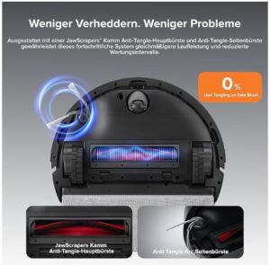 - Dual Anti-Tangle System: Der roborock Q10 X5 ist mit einer JawScrapers-Kamm Hauptbürste und einer bogenförmigen Seitenbürste mit Verhedderungsschutz ausgerüstet, die reibungslosere Reinigung mit weniger Unterbrechungen sicherstellen. Dieses fortschrittliche System minimiert Verhedderungen, sodass weniger ständige Wartung erforderlich ist und eine effizientere und mühelose Reinigungserfahrung ermöglicht wird.