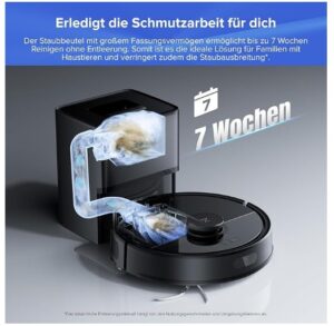 - 7 Wochen ohne manuelle Eingriffe: Genieße sorgenfreie Reinigung mit der selbstentleerenden Dockingstation und einem großen Staubbeutel mit 2,7 l – der bis zu 7 Wochen lang nicht entleert werden muss. Ideal für vielbeschäftigte Familien und Haustierbesitzer. Außerdem hilft dir das smarte Laden außerhalb der Spitzenzeiten beim Energiesparen und hält deinen Roboter stets einsatzbereit.