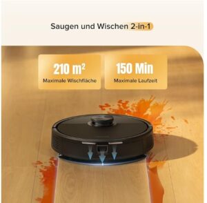 - Erweiterte Reinigungszeit: Der kombinierte 400ml-Staubbehälter und der 270ml-Wassertank decken große Flächen effizient ab und ermöglichen bis zu 150 Minuten kontinuierliches Wischen über 210 m² (nur Wischen) mit einer einzigen Ladung.