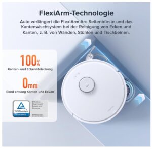 - FlexiArm Design: Die FlexiArm Arc Seitenbürste und das Kantenwischsystem, die exklusiv von Roborock angeboten werden, ermöglichen eine unvergleichliche Reinigungsabdeckung, da blinde Flecken beseitigt werden und somit kein Schmutz zurückbleibt.