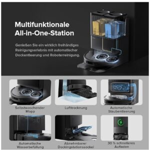 - Multifunktionales Dock: Diese kompromisslos, vollständig automatisierte Dockingstation entleert und wäscht den Roboter, damit du dich aufdas konzentrieren kannst, was dir wirklich wichtig ist.(Selbstwaschend/Selbsttrocknend/Selbstentleerend/Selbstnachfüllend/Abnehmbare Basis).