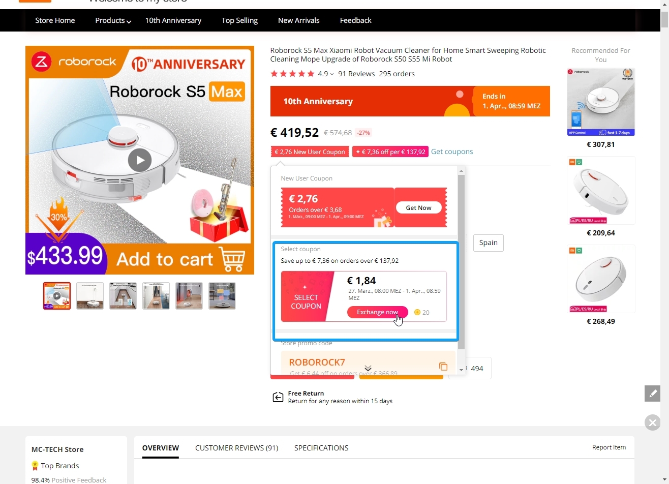 Der Vergleichspreis ist wahrscheinlich aber nicht korrekt. Er beträgt für den weißen 431,39€: https://www.idealo.de/preisvergleich/OffersOfProduct/200074715_-roborock-s5-max-xiaomi.html