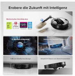 - 7.98 cm Ultraflaches Design und dennoch leistungsstark – 7.98 cm Design für maximale Reichweite: Trotz eines mechanischen Arms, Doppelkameras und leistungsstarker Saugleistung bleibt der Saros Z70 mit einer ultradünnen Höhe von nur 7.98 cm kompakt. Er gleitet mühelos unter Möbel und in enge Bereiche und lässt keinen Staub zurück.