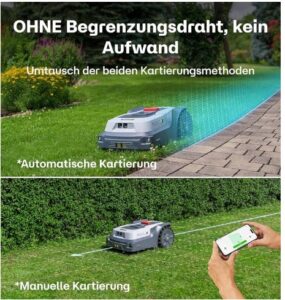 - Virtuelle Kartierung – keine Begrenzungskabel erforderlich, unbegrenzte Mähzonen, schnell einsatzbereit: Dank RTK-GNSS und KI-Kamera benötigt der T600 Rasenmäher Roboter keine Begrenzungskabel. In der RoboUP-App kannst du unbegrenzt viele Mähzonen manuell festlegen oder automatisch kartieren lassen. To-Go- und No-Go-Zonen sorgen für einen sicheren und effizienten Mähvorgang. Keine Sorge wegen der Joystick-Steuerung – du kannst die Grenzen jederzeit anpassen, ohne die Karte komplett neu erstellen zu müssen.