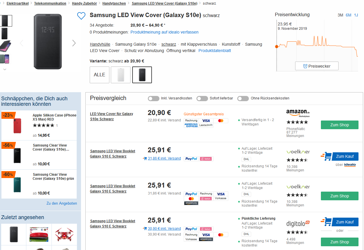 Bei Saturn & Mediamarkt bekommt man die SAMSUNG LED View Cover Handyhülle, Samsung Galaxy S10e, Schwarz oder in Weiss für 10,00 Euro bei Abholung sonst kommen für Versand 1,99 dazu PVG ab 20,90 Euro