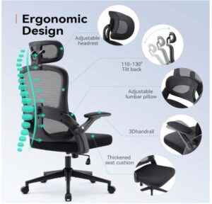 - Die einstellbaren hochklappbaren Armlehnen dieses großen und hohen Bürostuhls können vor und zurück bewegt sowie links und rechts geschwenkt werden und bieten Unterstützung für Ihre Arme und Ellenbogen während der Arbeit. Außerdem können Sie diesen ergonomischen Heimbürostuhl unter Ihren Schreibtisch schieben, um den Platz optimal zu nutzen.