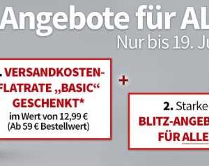 Im Aktionszeitraum von 15. bis 19.07.2019, 10 Uhr schenken wir Ihnen die Versandkosten-Flatrate Basic zu Ihrer Bestellung ab 59 €. Dank der Versandkosten-Flatrate Basic erhalten Sie 12 Monate lang jede Lieferung (ab einem Bestellwert von 10 €) an bis zu 5 verschiedene Adressen innerhalb Deutschlands versandkostenfrei.