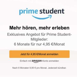 Netter Deal für alle Studis und Azubis unter uns: Amazon Audible 6 Monate für je 4,95€ (statt 10€ mtl.) wenn ihr Amazon Prime Student Mitglied seid (1. Jahr kostenlos):