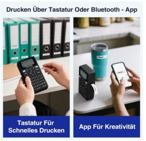 - Einfaches Drucken im Dualmodus: Individuelle Etiketten und schneller Druck über QWERTZ-Tastatur/KATASYMBOL-App