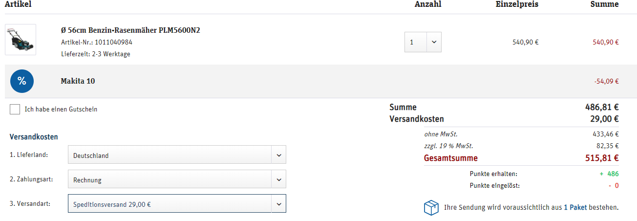 Zum Beispiel findet man den MAKITA Ø 56cm Benzin-Rasenmäher PLM5600N2 für 515,81€ inkl. Versand bzw. Speditionskosten (PVG laut idealo ~543€)