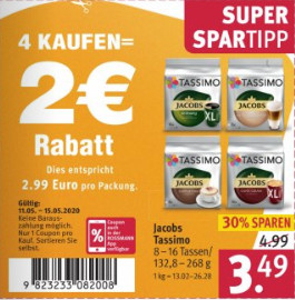 Bei Rossmann gibt es ab morgen Tassimo Kaffeekapseln zu einem sehr günstigen Preis. Im Sonderangebot ist Tassimo für 3,49€/Packung. Wenn man 4 Packungen kauft, kann man den 2 Euro-Sparcoupon (am Regal oder im Wochenprospekt) einsetzen. Dann kostet jede Packung nur noch 2,99€ .