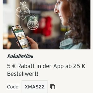 Heute verbirgt sich im Tchibo Adventskalender ein 5€ Gutschein, den ihr nur in der Tchibo App ab 25€ Bestellwert einlösen könnt.