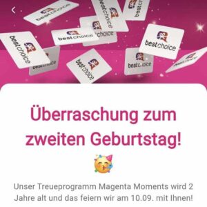 Den zweiten Geburtstag von Magenta Moments wollen wir gemeinsam mit Ihnen feiern. Wir verschenken 5€ BestChoice Gutscheine im Gesamtwert von 1 Mio €! So haben Sie selbst die Wahl, welches Geburtstagsgeschenk Sie sich