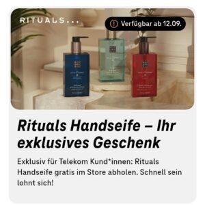 Ab 12.09.25 können sich Telekomkunden mit Laufzeitvertrag eine Rituals Handseife (300 ml) in einem Rituals-Store gratis abholen!