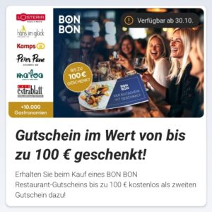 Wir schenken Ihnen beim Kauf eines BON BON Restaurant-Gutscheins bis zu 100 € zusätzlich.