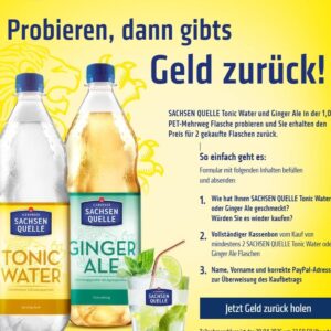SACHSEN QUELLE Tonic Water und Ginger Ale in der 1,0l PET-Mehrweg Flasche probieren und den Preis für 2 gekaufte Flaschen zurück erhalten.