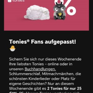 Gültig bis zum 24.03.2024 | Kein Click & Collect möglich | Gilt auf alle Content-Tonies im Wert von 16,99€ und auf Kreativ-Tonies im Wert von 12,99€ | Einzelne Artikel können ausgeschlossen sein | Der Rabatt wird Ihnen automatisch im letzten Schritt der Bestellung (Bestellübersicht) abgezogen. Im Warenkorb wird der Rabatt nicht angezeigt. Schöne Ostern!