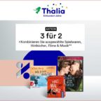 Bis zum 28.02.19 läuft bei Thalia eine 3 für 2 Aktion. Die 3-für-2 Aktion bezieht sich ausschließlich auf die auf der Deal Seite ausgewählten Sortimente und Artikel. Sie können die Sortimente Film, Musik, Hörbuch und Spielwaren miteinander kombinieren. Suchen Sie sich aus den Produkten drei Artikel aus und legen Sie diese in den Warenkorb. Der jeweils günstigste Artikel wird Ihnen automatisch im Warenkorb abgezogen.