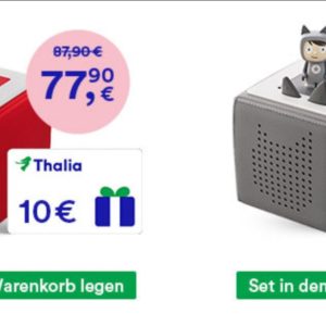 Jetzt gibt es bei Thalia beim Kauf einer reduzierten Toniebox auch noch gratis dazu eine 10€-Geschenkkarte.