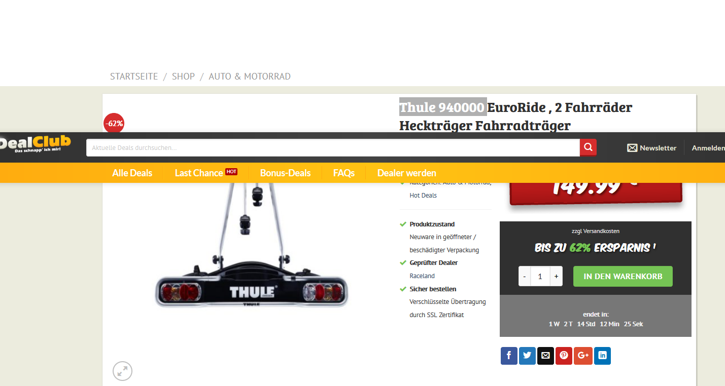 Bei DealClub erhaltet ihr die Thule 940000 EuroRide , 2 Fahrräder Heckträger Fahrradträger für 149,99 statt PVG ab 198 Euro inkl.Versand.