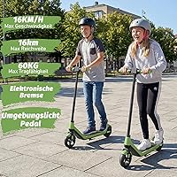 - Elektroroller für Kinder von 6–12 Jahren mit 3 Geschwindigkeitsstufen (6 / 10 / 16 km/h) und 130W Brushless-Motor.