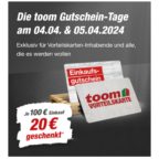 TOOM schenkt dir für deinen Einkauf im toom Baumarkt am Donnerstag, den 04.04.2024 oder am Freitag, den 05.04.2024 je 100 € Einkaufswert einen Gutschein im Wert von 20 €*. Gültig auf alle Einkäufe im Onlineshop und in den Märkten. Bei Online-Bestellungen wird der Gutschein circa 14 Tage nach der Bestellung per E-Mail zugestellt.