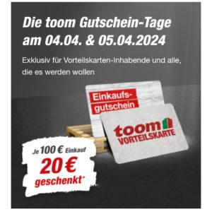 TOOM Baumarkt – bis 05.04.24 Je 100 € Einkaufswert 20 € Gutscheinkarte geschenkt!