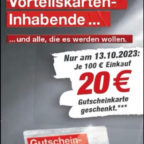 Am 13.10.23 bekommt man toom Gutschein bei 100€ Einkauf 20€ Geschenk.