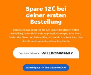 Ihr habt noch nie bei Lieferando bestellt? Dann wird es vielleicht jetzt mal Zeit. Mit dem Gutschein WILLKOMMEN12 bekommt ihr satte 12€ Rabatt bereits ab einem MBW von 20€. Wenn ihr zu zweit bestellt, habt ihr den Bestellwert sicher schnell erreicht oder auch alleine 😀