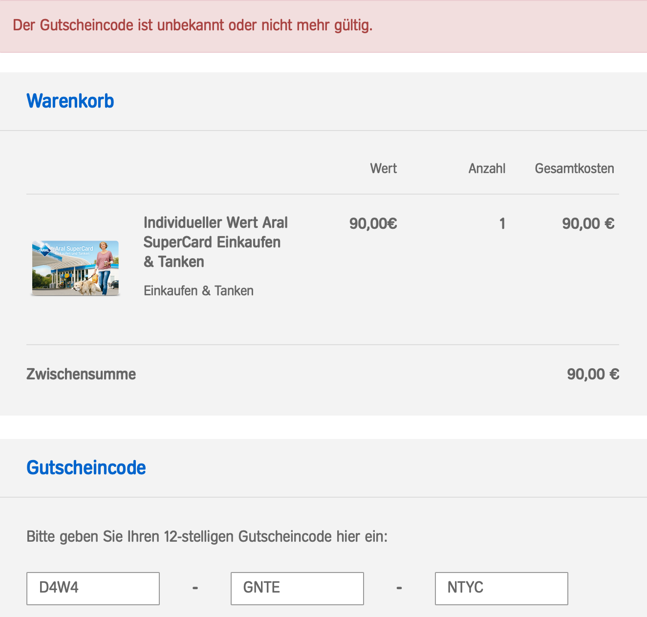 * Der Gutscheincode gilt nur in Verbindung mit einer individuellen Aral SuperCard Einkaufen & Tanken mit 90 € Wert. Bei gültigem Guitscheincode wird der Bestellung eine 5 € Euro Aral SuperCard hinzugelegt und die Versandkosten und Gebühren entfallen. Gültig bis zum 27.10.2019