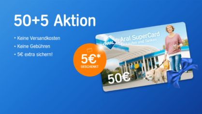 * Der Gutscheincode gilt nur in Verbindung mit einer individuellen Aral SuperCard Einkaufen & Tanken mit 50 € Wert. Bei gültigem Guitscheincode wird der Bestellung eine 5 € Euro Aral SuperCard hinzugelegt und die Versandkosten und Gebühren entfallen. Gültig bis zum 24.11.2019 | Hinweis: Code gilt für eine Bestellung pro Tag.