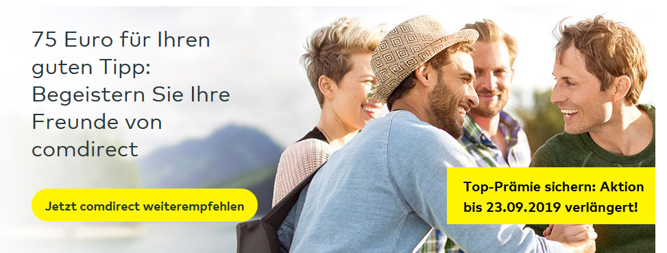 *Sie erhalten 100 Euro Prämie, wenn Ihr Depoteröffnungsantrag als Neukunde im Aktionszeitraum 26.08.2019 bis 06.10.2019 bei uns eingegangen und eröffnet ist und Sie mindestens 3 Trades (außer Eurex, CFD-Handel und Aktien-Neuemissionen) innerhalb von 14 Tagen nach Depoteröffnung getätigt haben. Die Prämie über 100 Euro schreiben wir Ihrem Verrechnungskonto 24 Tage nach Depoteröffnung gut. Zu den Trades zählen auch Sparplanausführungen. Neukunde ist, wer in den letzten 6 Monaten vor Depoteröffnung nicht bereits Kunde der comdirect war. comdirect behält sich vor, dieses Angebot jederzeit zu modifizieren, zu verlängern oder zu beenden. Die mehrfache Teilnahme ist ausgeschlossen. Jeder Teilnehmer hat – auch bei Eröffnung von mehr als einem Depot – nur einmal Anspruch auf den Prämienerhalt. comdirect Mitarbeiter sind von der Aktionsteilnahme ausgeschlossen.