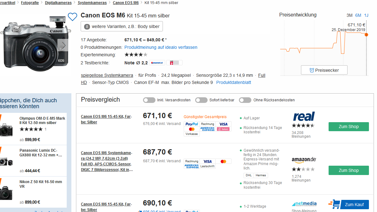 Top Preis bei proshop.de bekommt ihr derzeit die Canon EOS M6 15-45mm – Silver für 399,00 statt PVG ab 676,00 Euro inkl.Versand
