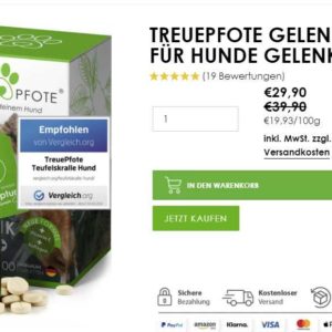 Guten Morgen, TreuePfote senkt den Preis ihrer Hunde Gelenktabletten auf 20,93€ mit dem COUPON „FRÜHLING30“.PVG liegt bei 29,90€. Im Verlauf sieht man dass 20,93€ sehr gut sind, auch auf Amazon sind sie für 29,90€ drin